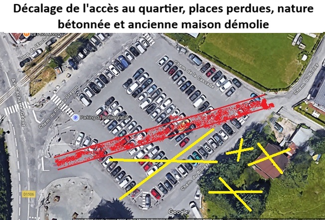 | Réduire la surface et le volume du funérarium (rectangle jaune), en plus de réduire l'empreinte carbone de la construction, permet de sauvegarder pas mal de places de parking, de garder la maison ancienne et de la rénover (logement? accueil tourisme? Info biodiversité en lien avec le projet de valorisation de la Prairie ? ), de ne pas enclaver la maison des Leclerc-Taberlet, d'aménager un accès piéton à la Prairie, de sauvegarder le vieux pommier, etc.. Aménager quelques places de parking devant le cimetière (sans abattre d'arbres) pour les usagers du cimetière et du funérarium permettra de préserver l'intégralité de la Prairie et le point de vue paysager depuis le chemin de la Cascade. | |